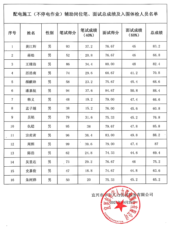 2024年10月宜兴市宜能实业有限公司公开招聘配电施工(不停电作业)外包辅助岗位人员相关面试工作已完成。现根据公告要求,将笔、面试总成绩及入围体检人员名单进行公示,公示期2天,2024年10月26至2024年10月27。