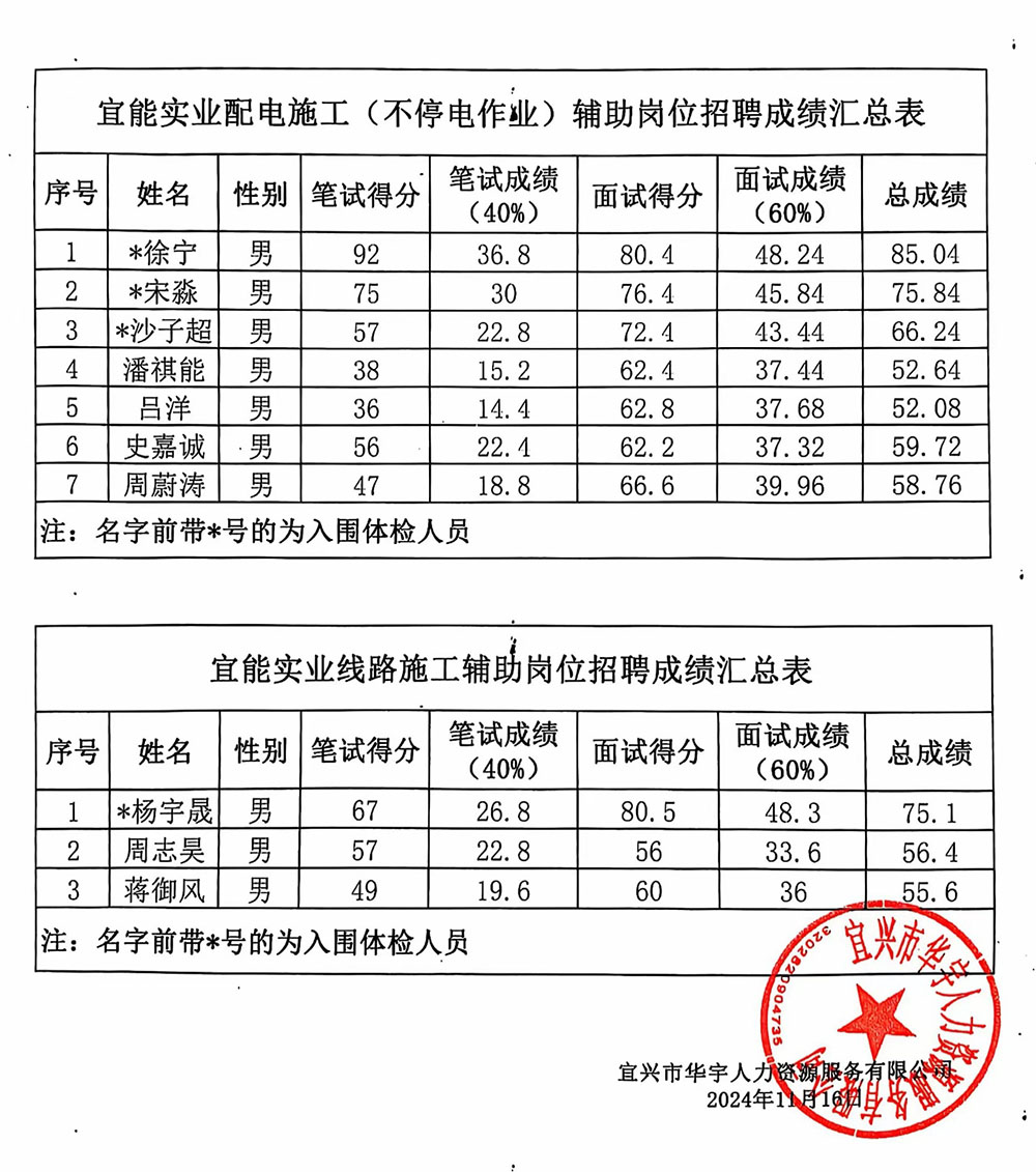 2024年11月宜兴市宜能实业有限公司公开招聘配电、线路施工外包辅助岗位人员相关面试工作已完成。现根据公告要求,将笔、面试总成绩及入围体检人员名单进行公示,公示期2天,2024年11月16至2024年11月17。